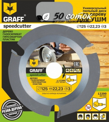 Пила по дереву для болгарки! Пила трехзубая дисковая по дереву speedcutter - 125x3,8x22,23 мм с максимальной скоростью вращения 12 200 об.мин. Уникальность данного пильного диска заключается в том что он предназначен для использования в высокооборотистых угловых шлифмашинках, в отличии от своих многозубых собратьев, которые могут использоваться только в стационарных станках. Круг отрезной по дереву - только от GRAFF.